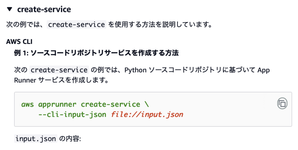 実際、公式ページのAWS CLI例を見ると、App Runnerの方が圧倒的にコマンドの記述量が少ないです。